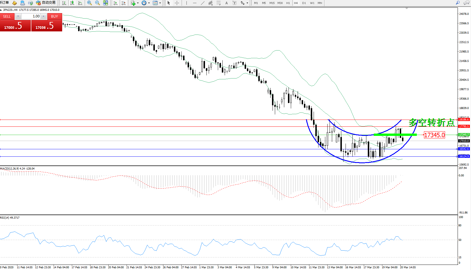 日经225指数3月19日(周四)收盘下跌180.05点,跌幅1.08%,报16546.50点。上周五日交易所休市,日内金融市场恐慌延续,美元再度走高,现金美元的紧缺令投资者依旧选择抛售所有有价资产,此外日本央行将视需要以灵活的方式应对市场形势,先前日本央行提议在计划外的操作中购买1万亿日元债券。这种购买旨在确保“在财年结束之前保持市场稳定”,日本财务大臣麻生太郎:预计日本将在控制疫情方面领先于美国。日本央行和财务省的合作关系良好。日本政府与日本央行之间的关系要远比美国政府与美联储的关系好。决策者必须以冷静的心态来应对当前的形势,而不是在市场上引发恐慌。