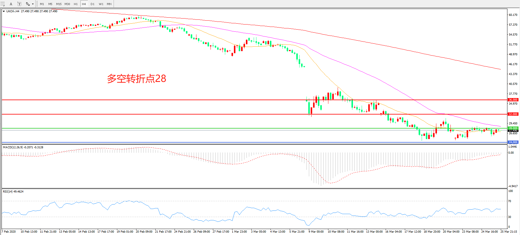 4小时图看,布油以28美元为支撑进行整理,整体出现止跌迹象,短期均线拐头,MACD绿柱减少,RSI指标走平,日内有可能出现反弹。