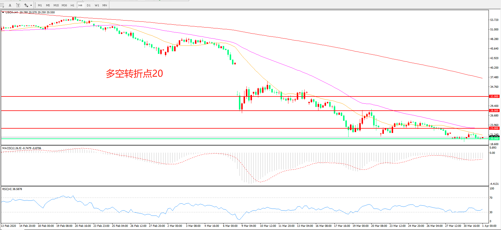 4小时图看,美油延续低位震荡,整体表现偏弱,20美元成为短期支撑,短期均线逐渐下压,MACD绿柱增加,RSI指标走平,日内延续震荡概率较大。