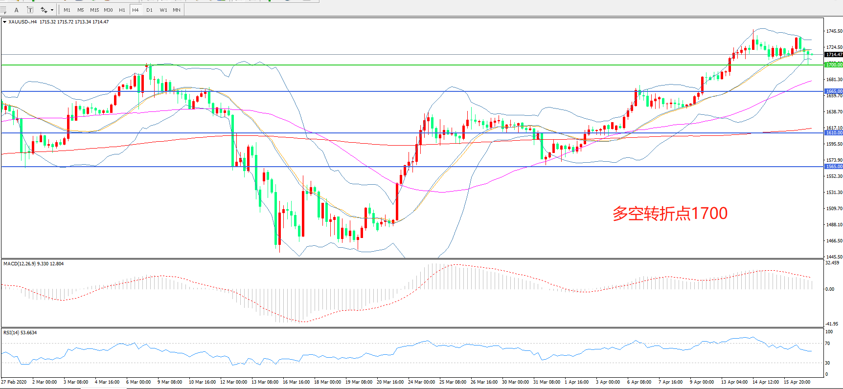 周四(4月16日),金价一度大涨1.26%,但随着美国当初请失业金数据好于预期,美元大幅走强,金价较日高回落逾30美元,收报1713.47美元/盎司。但在全球各国政府推出空前规模的央行和财政刺激措施的环境下,黄金仍然受到相当好的支撑。