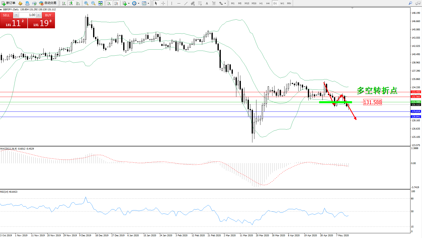 交易策略:131.588下方看跌,目标129.818、128.841