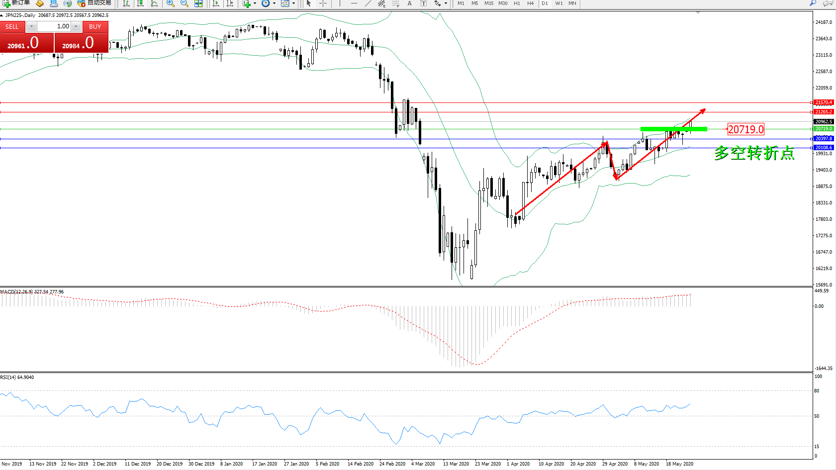 日经225指数5月25日(周一)收盘上涨334.34点,涨幅1.64%,报20722.50点。日股受潜在刺激计划的消息提振上涨,增强了风险偏好。不过国际关系趋于紧张,日本正考虑解除东京及其他仍面临限制地区的紧急状态,同时考虑推出接近1万亿美元的新刺激计划,以帮助企业渡过新冠疫情危机。日本首相安倍晋三将在25日晚间的政府对策总部会议上,解除基于新冠病毒特别措施法在北海道、埼玉、千叶、东京、神奈川5个都道县仍在持续的紧急事态宣言。政府上午召开向专家倾听意见的咨询委员会,就解除征询意见,并获得了同意。