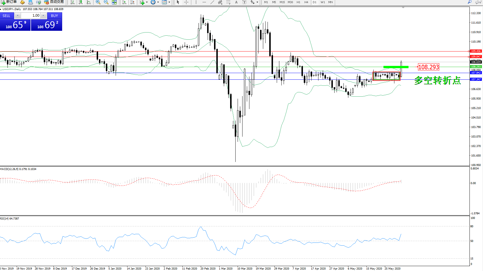 美元兑日元日内涨超百点,涨幅近1%,创49日以来新高至108.65,受益于市场乐观情绪、日本央行宽松预期和空头止损盘;近期全球股市攀升,市场乐观认为,由疫情引发的经济衰退最严重时期可能已经过去,带动风险情绪改善。虽然日本的经济活动出现了10多年来的最大降幅。不过金融市场仍乐观认为全球经济仍在复苏,这种乐观情绪施压避险日元,支持美元兑日元;62日日本央行发布的数据显示,截至5月底,日本基础货币量达到5万亿美元,连续第二个月创下历史新高,因该行正注入更多现金,来缓冲疫情对企业和消费者的打击。日本央行有大量的贷款计划,旨在刺激商业银行增加对现金短缺企业的贷款,预计将继续扩大其资产负债表,以缓解公共卫生危机的影响。