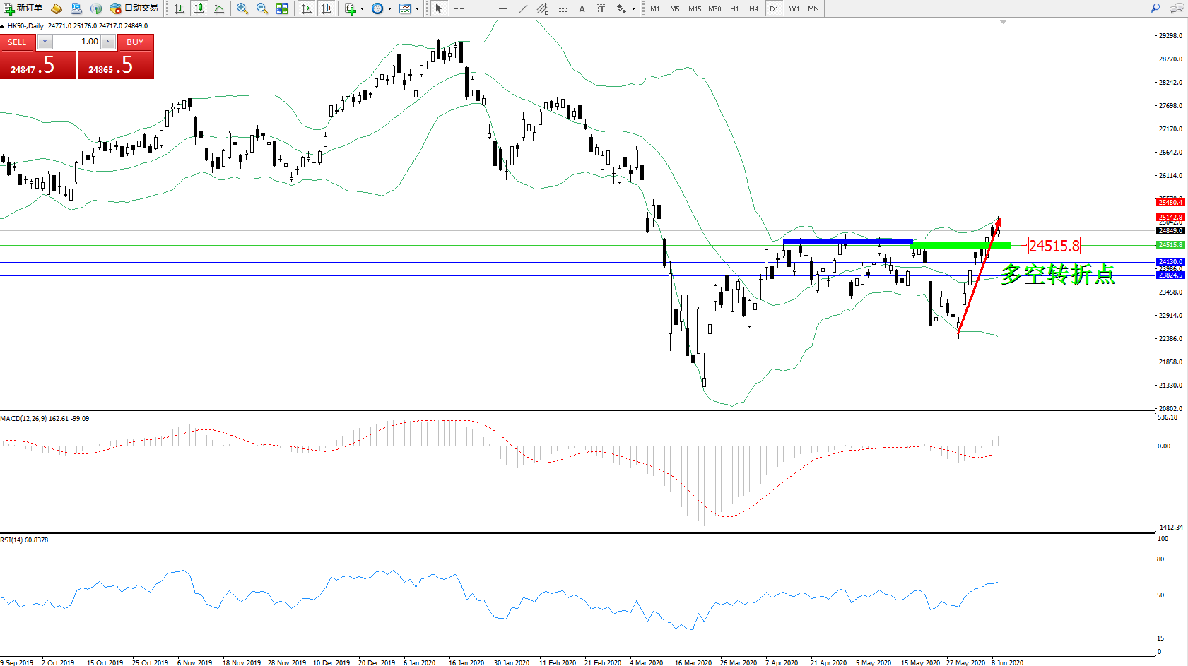 技术点评:多头动力强势拉升至布林带指标上轨内侧持续震荡上扬,突破前期高位整理区域压制节点后,仍有上行动力,布林带指标呈张口走势后又开始收口平移,MACD指标处于0轴线上方多头区域持续平缓上移中,RSI指标处于50均衡线上方持续整理上行中;