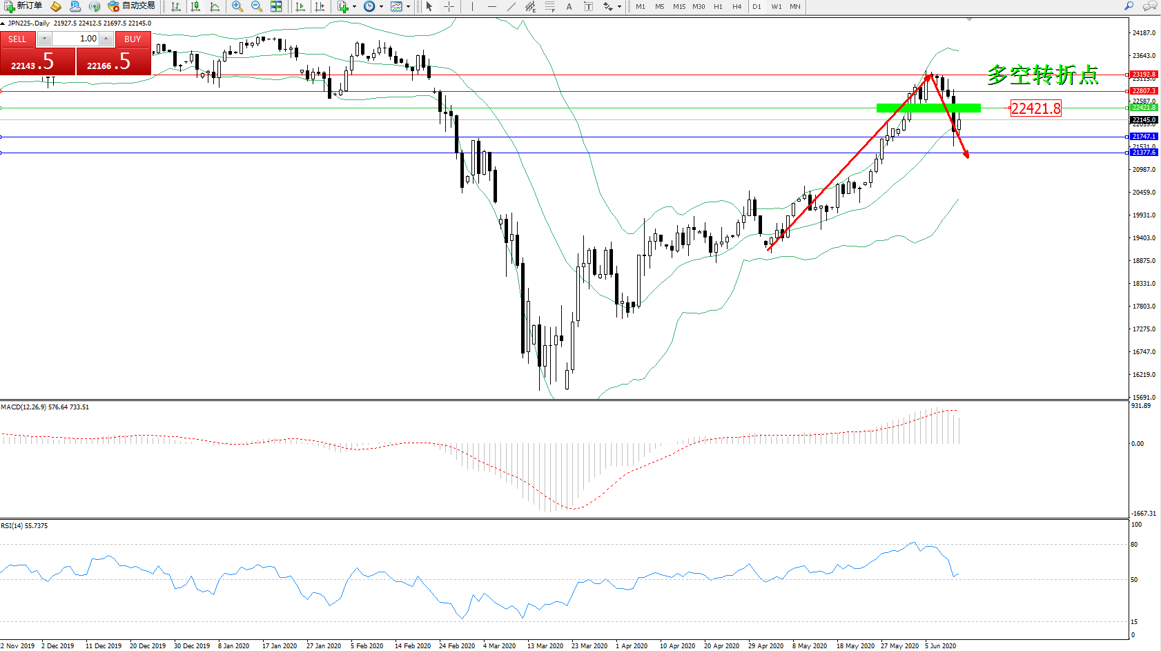 日经225指数6月12日(周五)收盘下跌180.41点,跌幅0.80%,报22292.50点。因为疫情危机,日本经济可能重陷衰退;日本2020年二季度GDP预计环比萎缩21.3%,第三季度料恢复增长8.0%;日本2020年全年GDP料同比萎缩5.2%,2021年料增长3.2%。日本首相安倍晋三可以不经国会审批就动用940亿美元应急资金,反对党议员把这笔钱称作安倍的“零花钱”,对如此巨大的数额感到震惊;安倍表示,我们会向国会报告,我们是如何根据需要在适当的时候支用这笔钱的;然而这笔资金的规模是通常储备金的20倍,几乎相当于日本教育和国防开支的总和,以至于对这笔钱的支出拥有裁量权的官员也心生疑问,周五日本国会料将通过该应急资金。