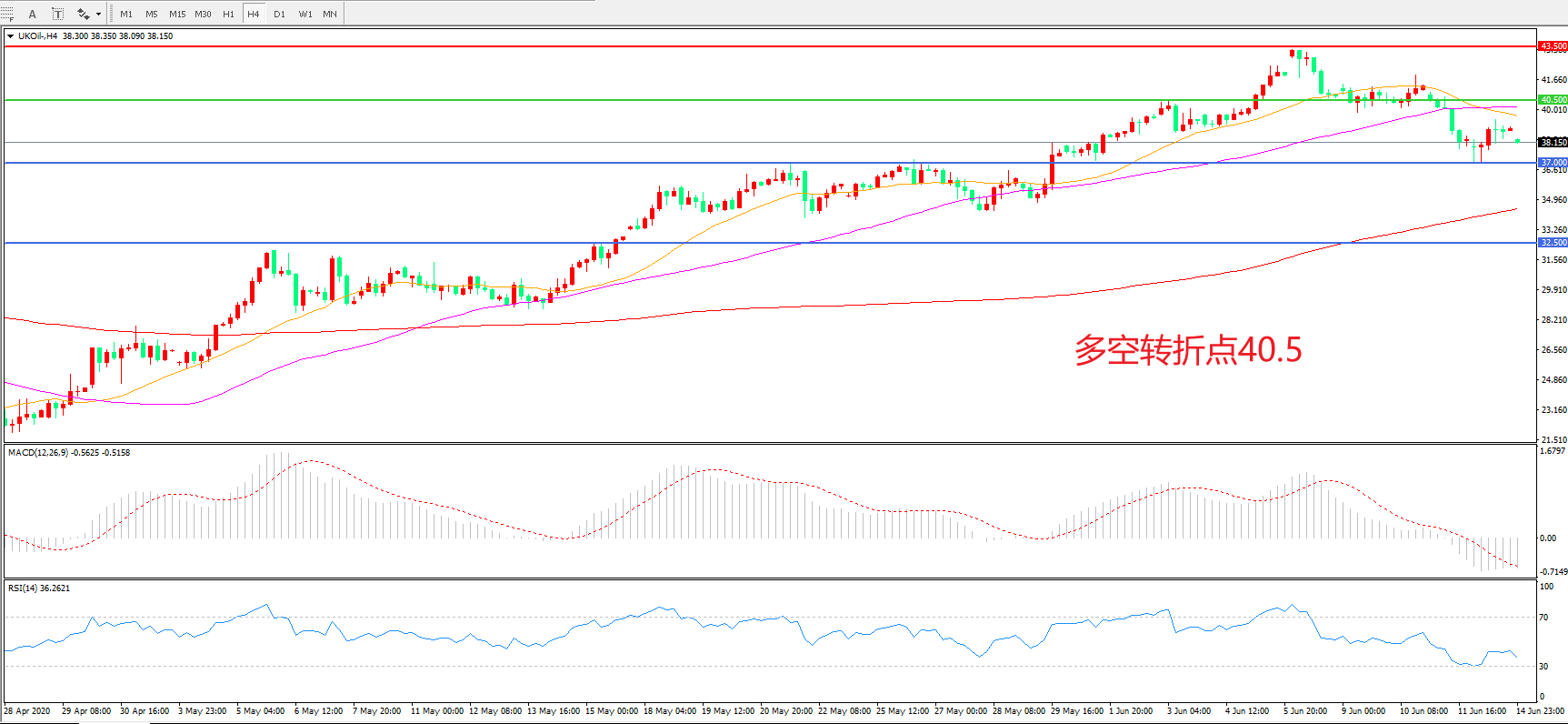 交易策略: 在40.50之下看跌,目标37.00 32.50