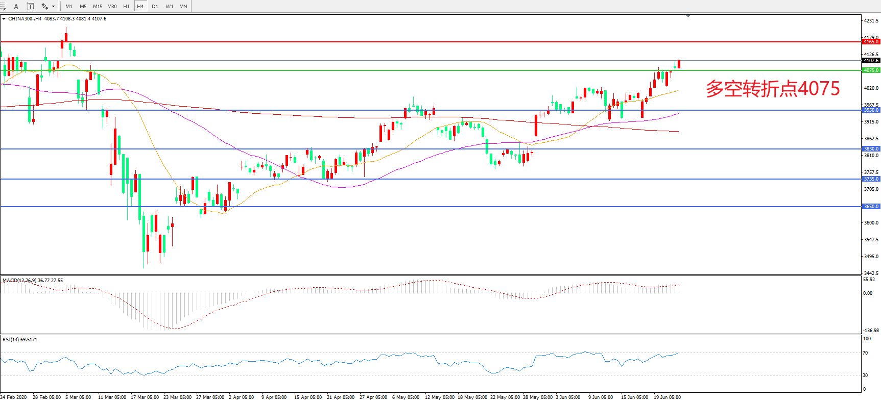 4小时图看,沪深300震荡上行, 4075一线成为多空争夺焦点,整体变现依然十分强势,21周期均线成为支撑, MACD红柱增加,RSI指标向上,日内延续震荡概率较大。