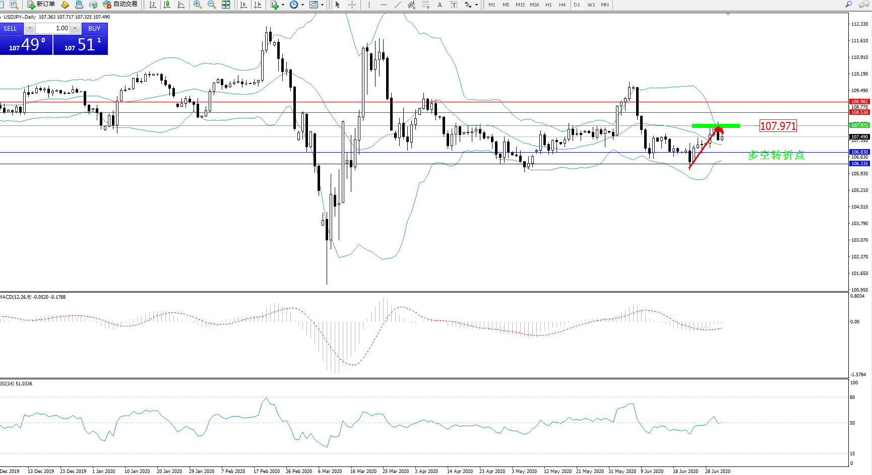 美元兑日元当前仍然处于盘整行情之众,眼下市场多空消息相抵,美国独立日假期,美国纽约证券交易日周五(73)休市一天。因此外汇市场波动整体有限,市场交投情绪谨慎,但此后若全球尤其是美国本土疫情传来乐观前景,那么美元兑日元将有再度上行的潜能,而反之,若消息面继续恶化,则避险日元将再度得到市场热捧,不过,由于日本央行此前丑话在先,一旦日元走势过强将引发干预力量入市,因此除非出现黑天鹅式意外事件,否则中短期内美元兑日元料也很难跌破106这一箱体下轨支撑。