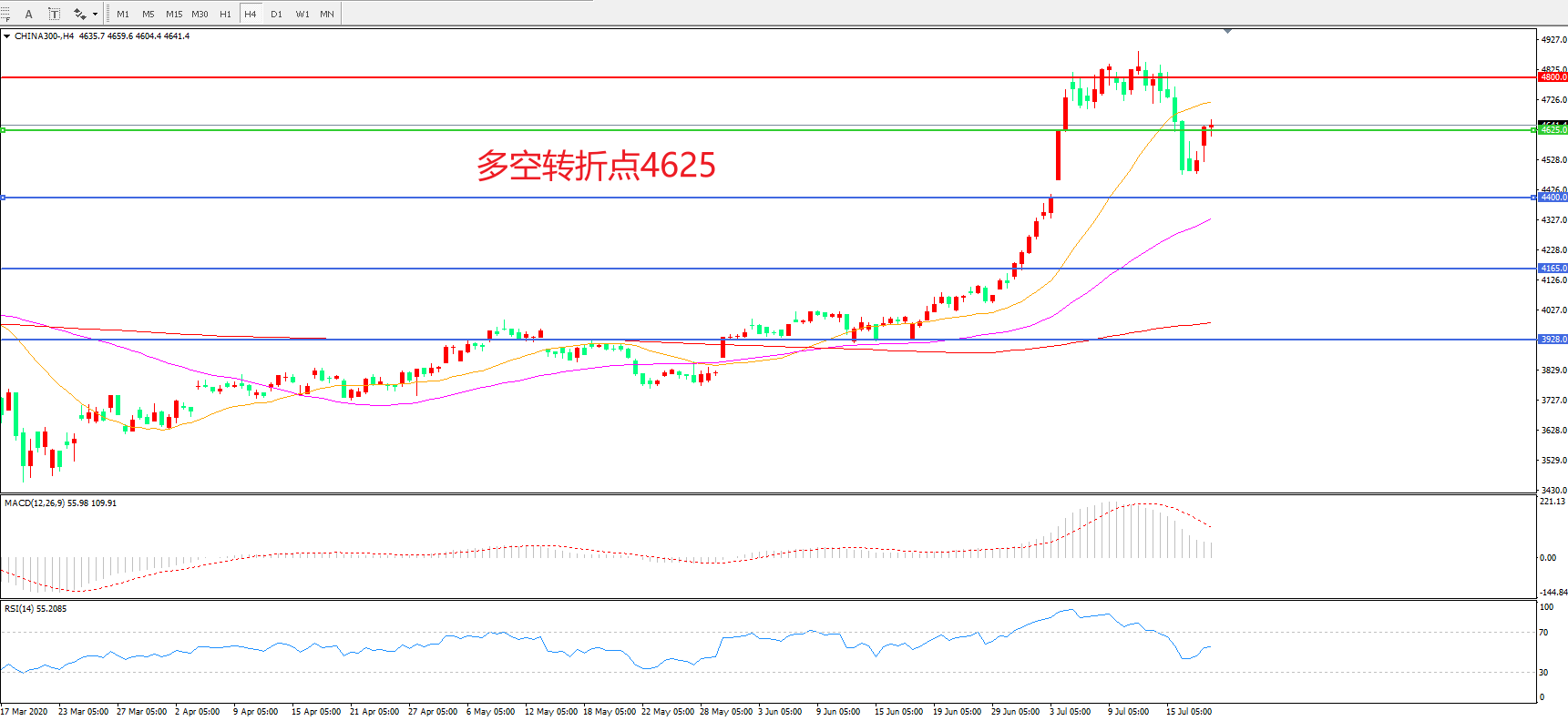 4小时图看,沪深300高开高走,整体表现强势,均线系统逐渐发散,4625成为短期多空分水岭, MACD红柱增加,RSI指标向上,日内延续震荡概率较大。