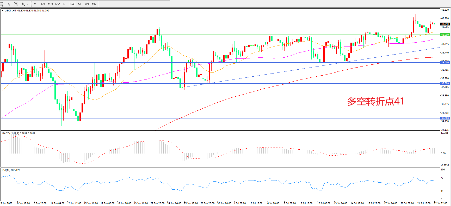 周三(7月22日),美方要求中方关闭休斯顿总领馆的消息突袭金融市场,美国WTI原油也出现跳水行情,但幅度并不是很大,短线拉高后收报41.80美元/桶。EIA原油库存增加489.20万桶,高于预期,但小于API增幅,油价先跌后涨,整体表现相对强势。