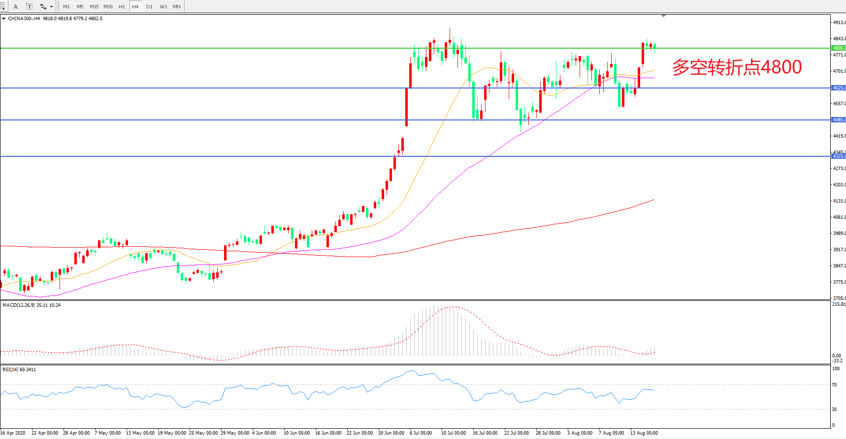 4小时图看,沪深300延续高位震荡,短期走势偏强,4800成为多空博弈焦点,均线系统走平, MACD红柱增加,RSI指标走平,日内延续上行概率较大。