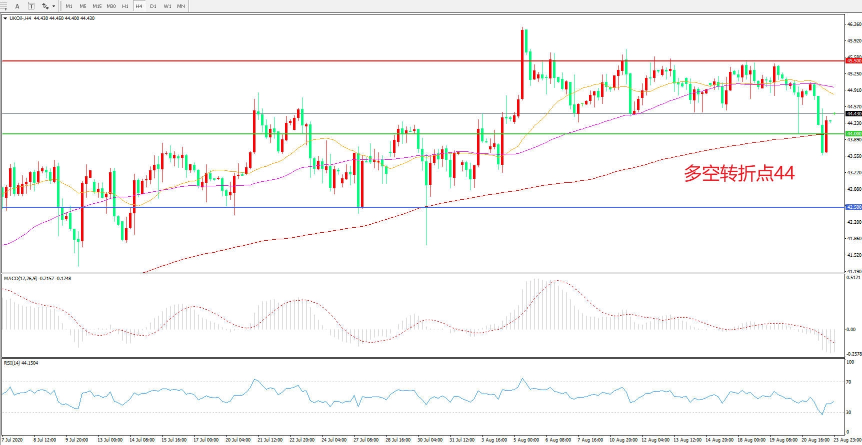 小时图看,油价呈现宽幅震荡形态,44美元一线成为短期支撑,短期均线系统走平成为上方阻力,MACD绿缩短,RSI指标走平,日内延续震荡概率较大