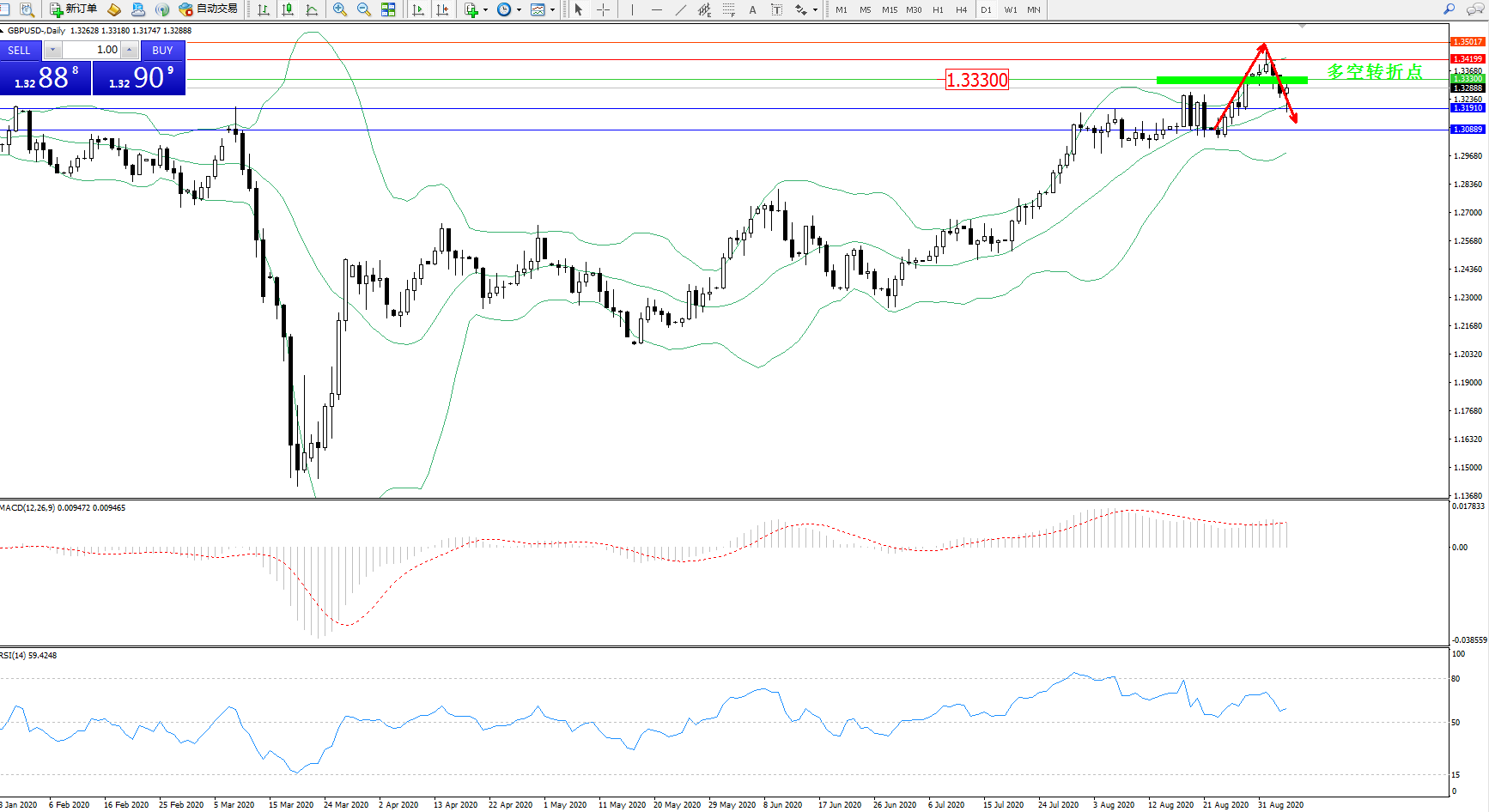 交易策略:1.33300下方看跌,目标1.31910、1.30889