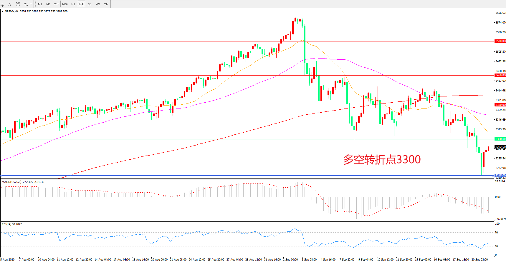 4小时图看,标普500长阴下破,短期走势十分低迷,均线系统呈空头排列, MACD绿柱增加,RSI指标走平,日内震荡下行概率较大。