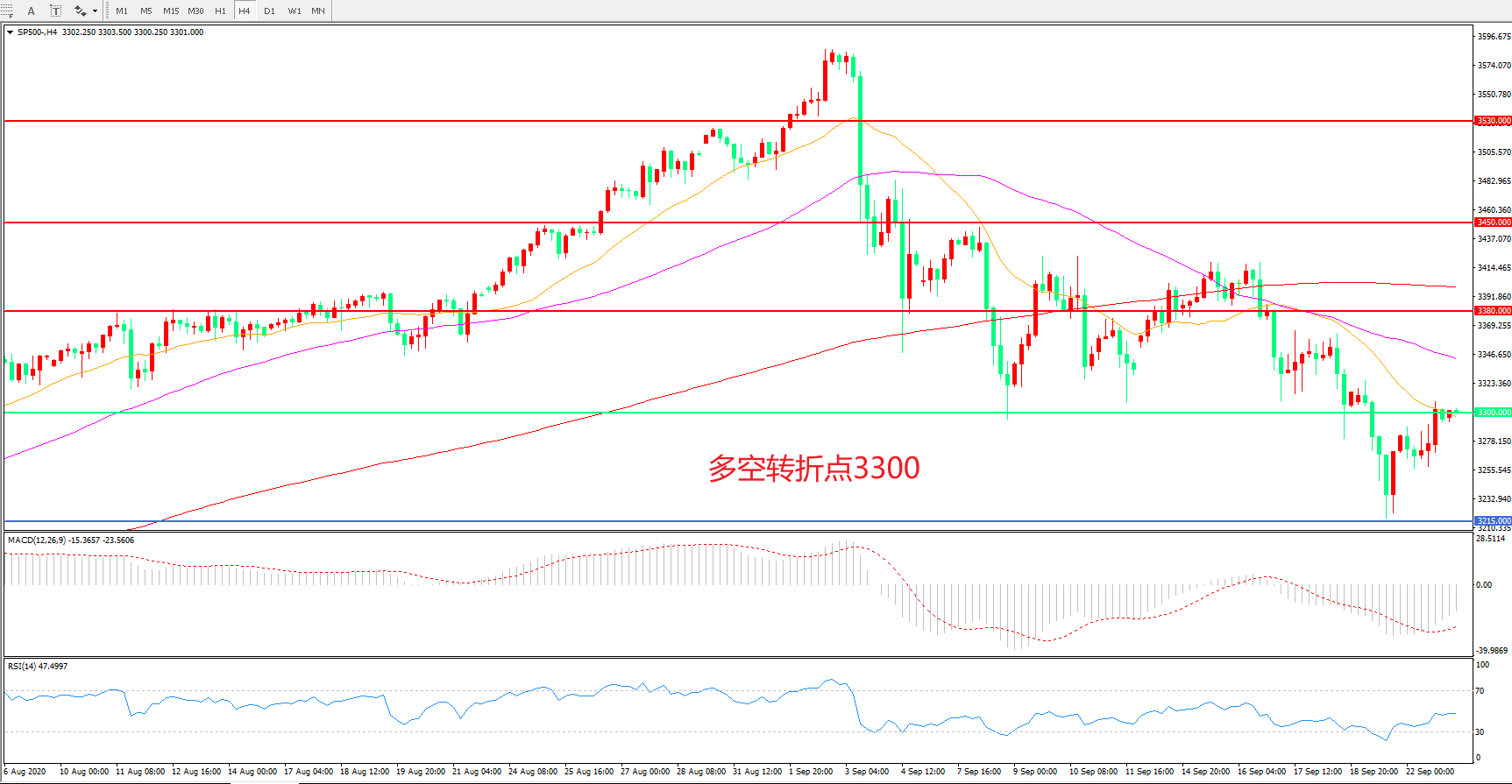周二(9月22日),美联储主席鲍威尔提前发布其众议院质询证词,表示将不惜一切代价支持经济复苏,标普500受到提振尾盘回升,收报3295点,结束日线四连跌。鲍威尔在作证时表示美联储将会进一步放松对银行的监管,同时呼吁和财政部联手从货币财政政策两方面支撑美国经济,经济“前景将取决于防疫效果,以及各级政府的政策行动。