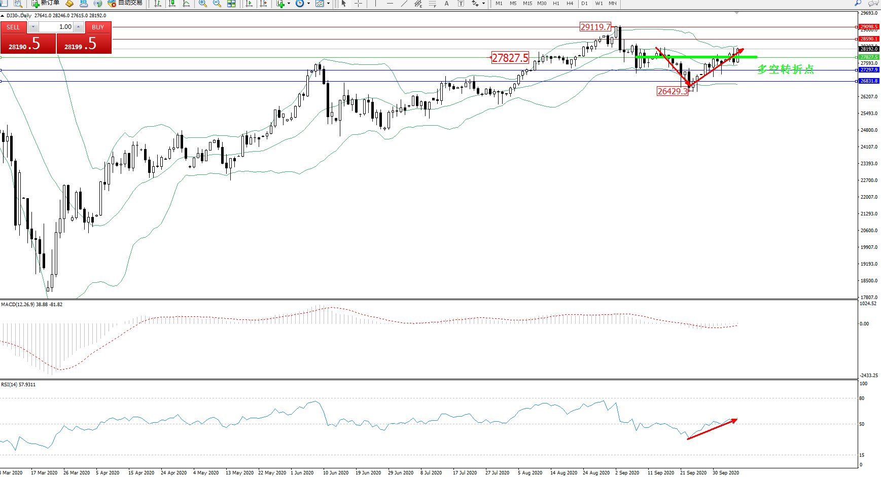 技术点评:空头动力延续布林带指标中下轨区间弱势下行至26429位置后得到支撑开始呈V型反转上移,触及布林带指标上轨附近后遇阻开始窄幅震荡中,布林带指标呈收口平移走势持续中,短期或将有事态突破上轨位置迹象,MACD指标处于0轴线附近弱势徘徊中,RSI指标纠结于50均衡线附近持续整理中;
