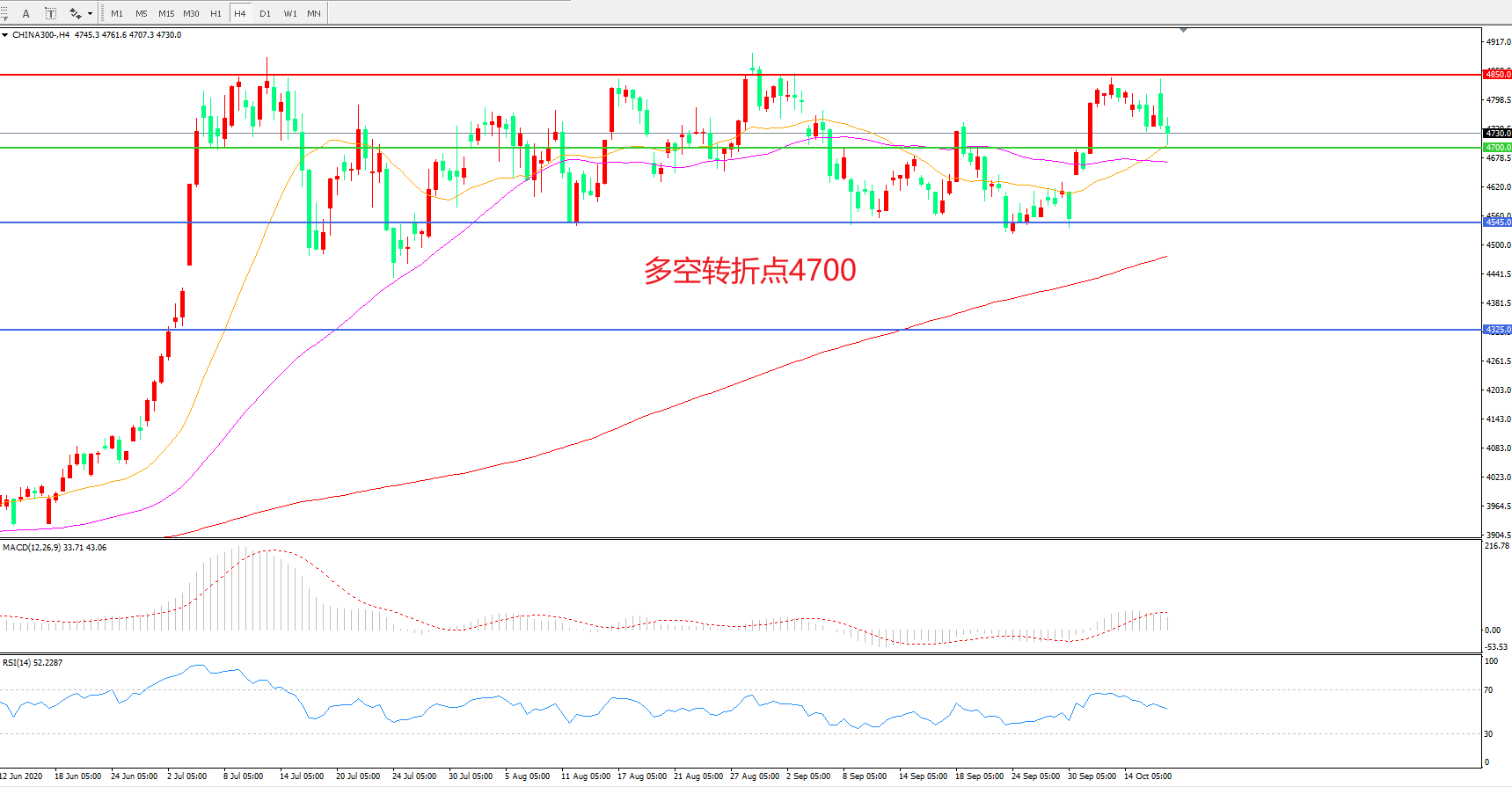 4小时图看,沪深300高开低走,短期延续高位震荡形态,4850成为明显阻力,4700成为短期支撑,均线系统走平, MACD红柱缩短,RSI指标向上,日内延续震荡概率较大。