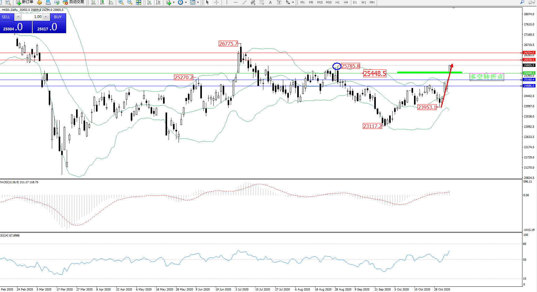 技术点评:多头动力处于布林带指标通道内维持宽幅整理走势,多头动力持续多次发力拉升上扬,突破布林带指标上轨附近节点后再度上扬,前期高位25785位置已然破位,且有继续上扬态势,布林带指标呈收口走势后再度张口持续上升,MACD指标处于0轴线上方维持窄幅整理平移中,RSI指标处于多头区域维持震荡拉升上扬走势持续;