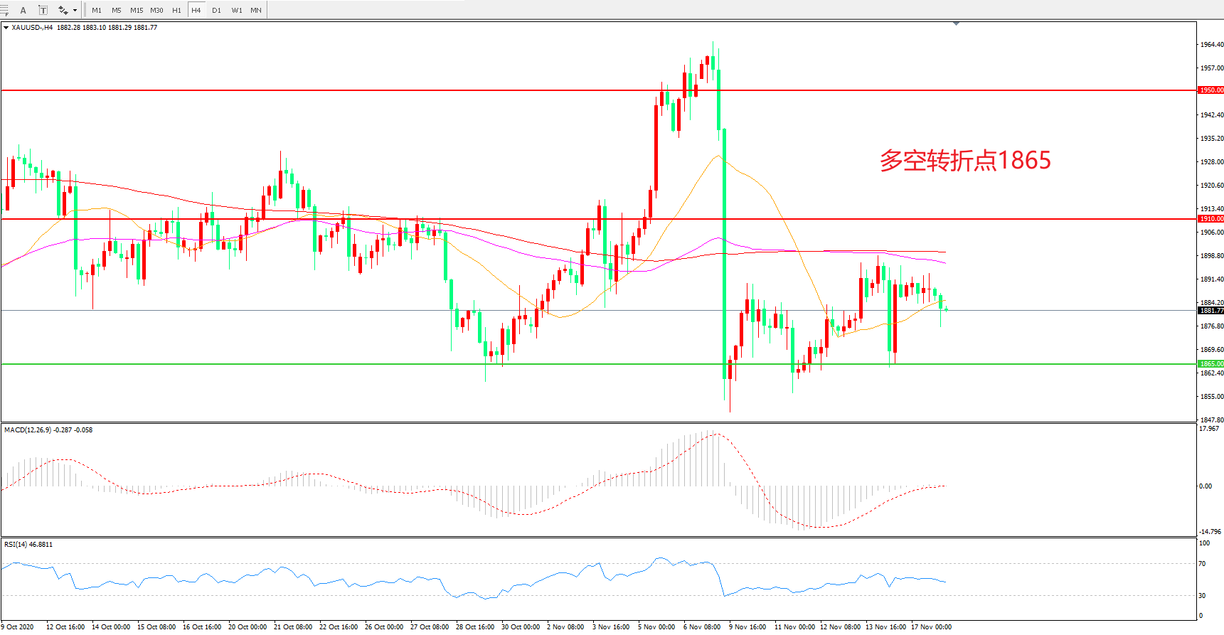 4小时图看,金价以1865为依托震荡反弹,短期走势陷入震荡,均线系统粘合形成上方阻力, MACD红柱缩短,RSI指标走平,日内延续震荡概率较大。