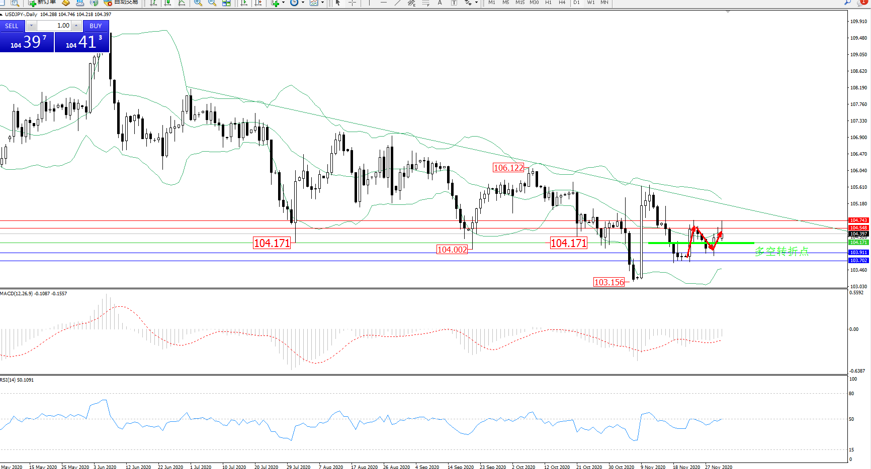 美元兑日圆弱势震荡上移至104.405附近整理,在英国方面此前率先批复的疫苗的正式临床应用之后,全球市场对疫苗得到应用的前景继续感到乐观,这令避险货币日内遭受抛售,在投资者继续抛售避险美元的同时,日元汇价则也额外承压。美元兑日元后市仍将在全球风险情绪的变化下维持同步进退的盘整走势,运行区间将限于103.70-104.80之间,一方面美元指数在美国财政政策前途仍然未卜的背景下继续承压,料限制汇价进一步上行突破105的空间,另一方面,全球市场消息面基调仍然乐观,且日本央行仍留有政策后手的状况,也会阻止日元汇价的过度上涨。