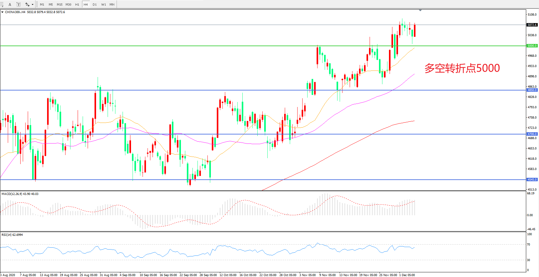 4小时图看,沪深300延续高位震荡,短期表现偏强,均线系统依然呈多头排列,5000成为下方支撑,MACD红柱增加,RSI指标向上,日内延续震荡概率较大。