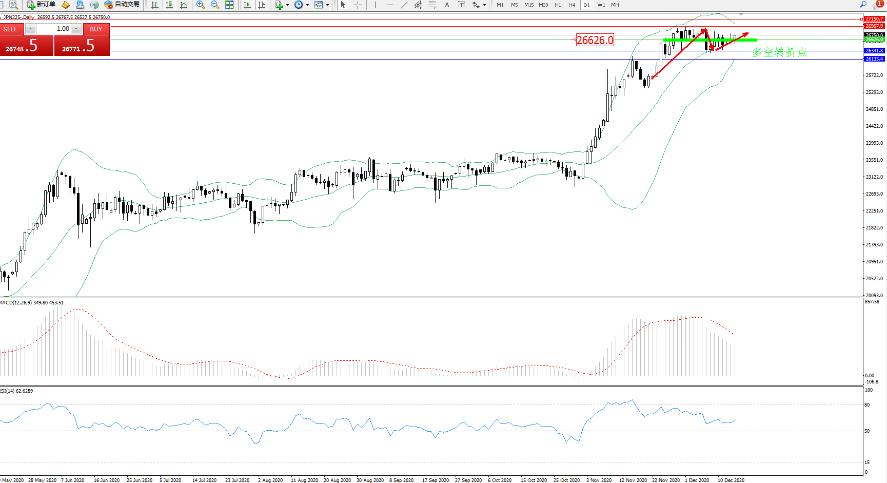 日经225指数12月15日(周二)收盘下跌57.44点,跌幅0.21%,报26675.00点。美国国会财政谈判取得“重大进展”的消息推动美元指数大幅反弹,此外日本央行也被爆出仍有空间实施更多宽松措施,市场正等待周三美联储决议的一锤定音。一个由两党议员组成的团体拿出了他们所提议9080亿美元疫情舒困方案的细节,将其分为两部分,以承认在州援助和雇主责任保护方面存在的巨大分歧。日本财务大臣麻生太郎:将向国会提交明年的额外预算,必须进行经济复苏和财政改革,以避免对公共财政失去信任,支出和收入方面都需要持续改革,将寻求经济复苏和财政健康,将寻求尽快通过第三份额外预算,需要灵活实施旅游活动,需要灵活实施“Go To Travel”补贴计划。日本东京新增460例新冠肺炎确诊病例,重症病例78例。