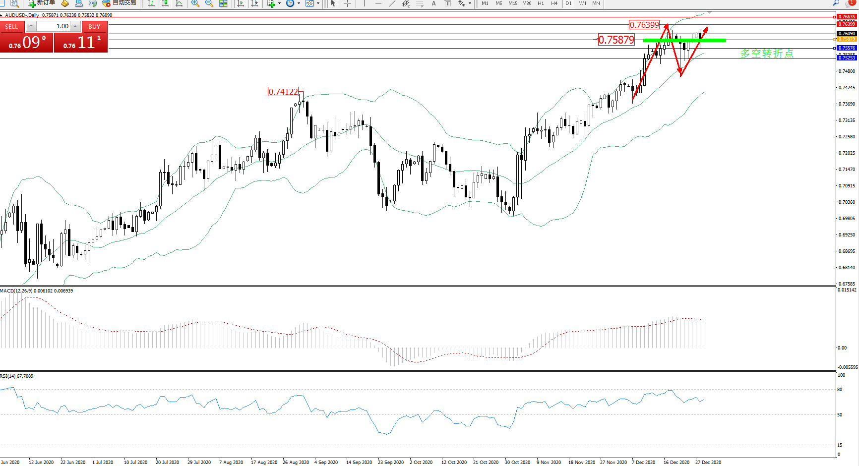 交易策略:0.75879上方看涨,目标0.76399、0.76635