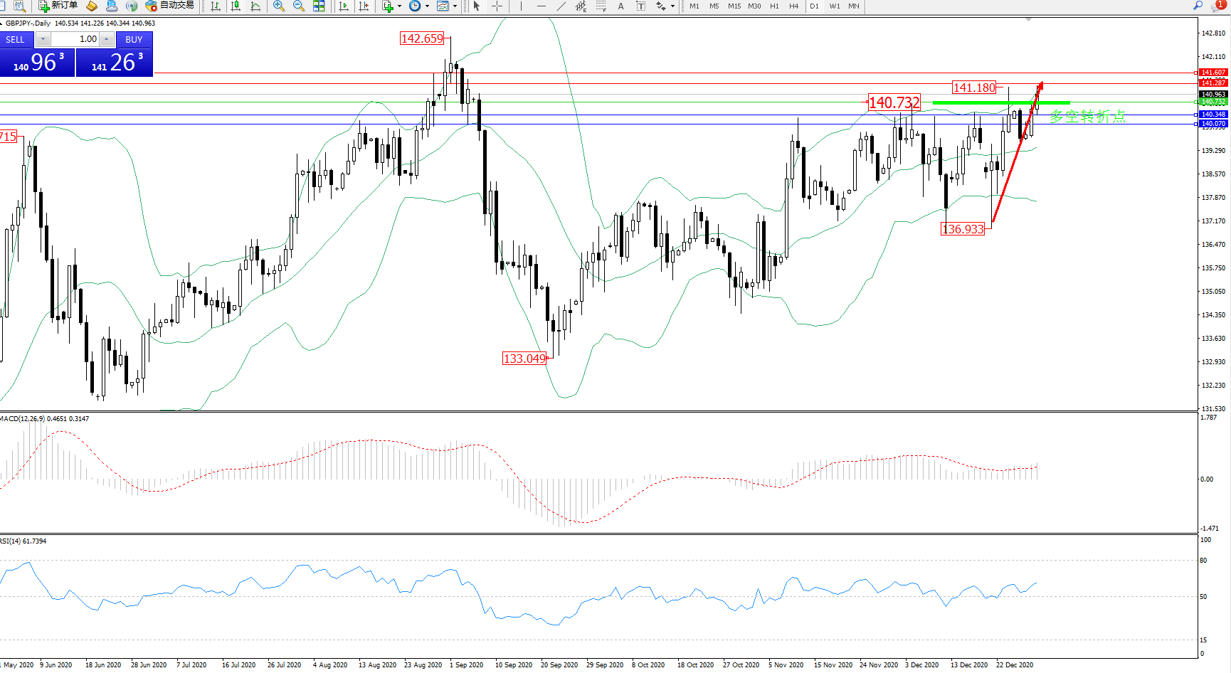 英镑兑日圆高位持续震荡上扬至140.963位置,受益于疫苗的利好消息及英国下议院通过脱欧协议带来的提振。另外在年末机构投资者进行仓位调整,外加节前市场交投清淡共同基本面的影响下,汇价暂时陷入震荡格局,未能进一步上攻,一方面,英国议员此前连夜无悬念批准了脱欧协议文本,并交付女王签署生效,这意味着英国脱欧流程在技术上终于彻底完成,投资者心中的石头也已经落地。另一方面,市场也对2021年全球复苏前景下非美货币继续走强的前景怀抱有极大信心。
