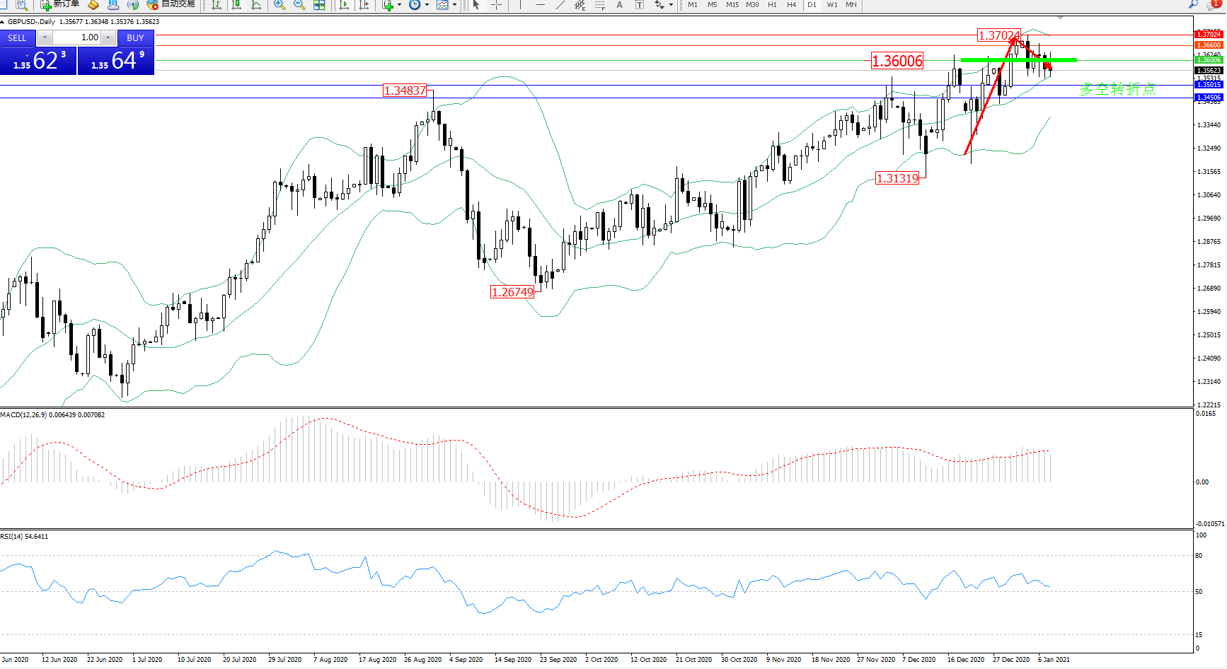交易策略:1.36006下方看跌,目标1.35015、1.34506