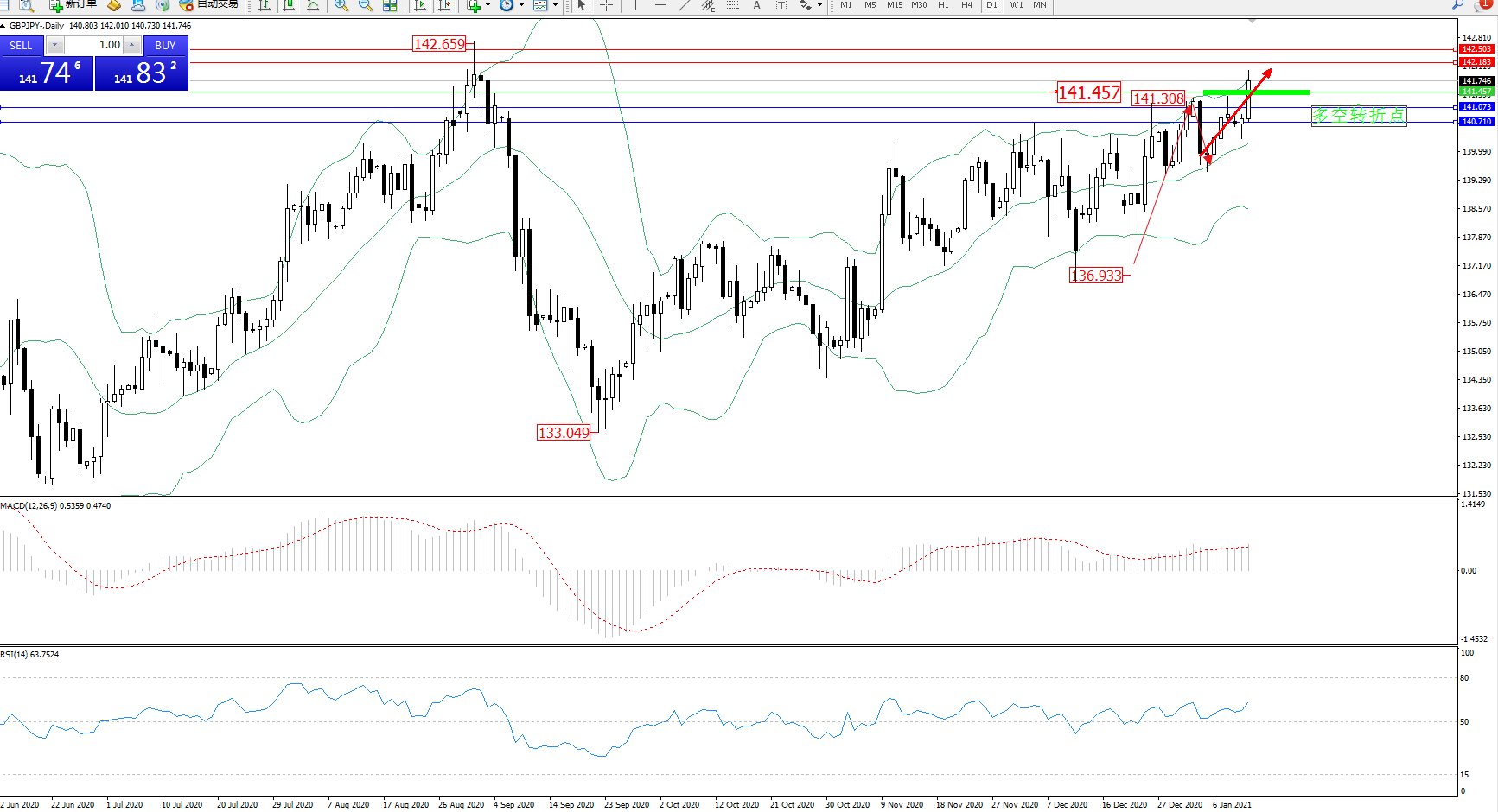 英镑兑日圆强势拉升至141.746附近整理,市场对美国出台更多刺激措施抱有希望,美国国债收益率进一步上扬,并支撑了美元,非美货币齐齐收到压制;由于担心新冠肺炎病例持续增加,以及欧洲为抗击新型冠状病毒而实施了严格的封锁限制,投资者的热情有所降温。不过值得注意的是,市场越发担忧新增病例继续飙升以及英国实施第三轮全国性封锁对经济的潜在影响。周二英国新增54940例新冠肺炎确诊病例,新增563例死亡病例。此外英国卫生部长汉考克表示,已经有近230万人接种了超过260万剂疫苗。疫苗交付的速度已达到每天近20万支,预计今天大规模注射中心的开放将支持加快这一速度。英国将继续在主要经济体中率先提供疫苗,这将为今年晚些时候更强劲的相对经济复苏创造条件。