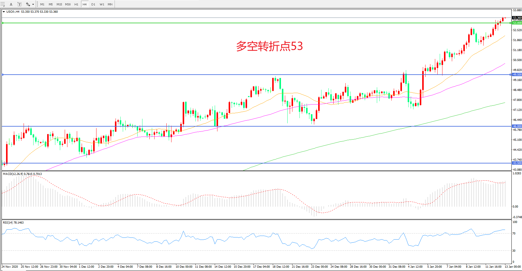 4小时图看,油价阳线连续拉升,反弹高点逐渐抬高,多头趋势十分明显,均线系统呈多头排列,MACD红柱减少,RSI指标走平,日内震荡上行概率较大。