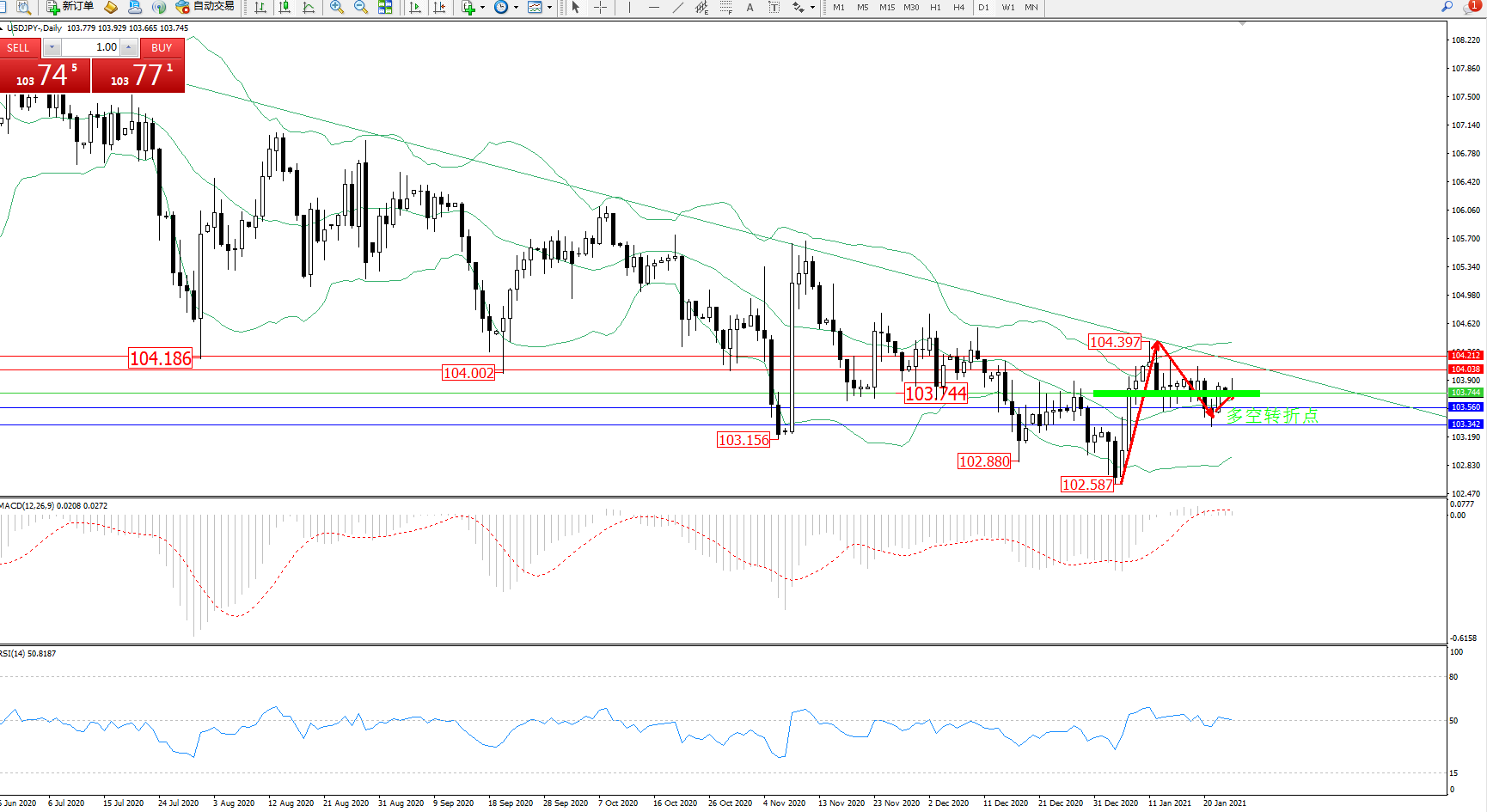 技术点评:空头动力延续布林带指标通道中下区间持续震荡下行至102.587附近节点后强势反转上扬,短暂突破上轨附近至104.397节点后维持整理平移中,纠结于中轨附近徘徊后再度回升,布林带指标呈张口走势后开始收口平移,MACD指标处于0轴线上方弱势徘徊中,RSI指标处于50均衡线附近弱势整理中;