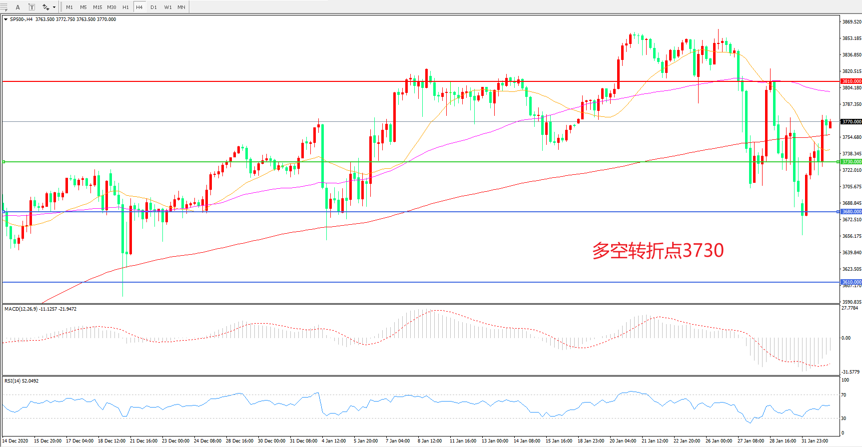 4小时图看,标普500回踩3680后震荡反弹,3730成为短期支撑,3810成为上方阻力,MACD绿柱缩短,RSI指标走平,日内延续震荡概率较大。