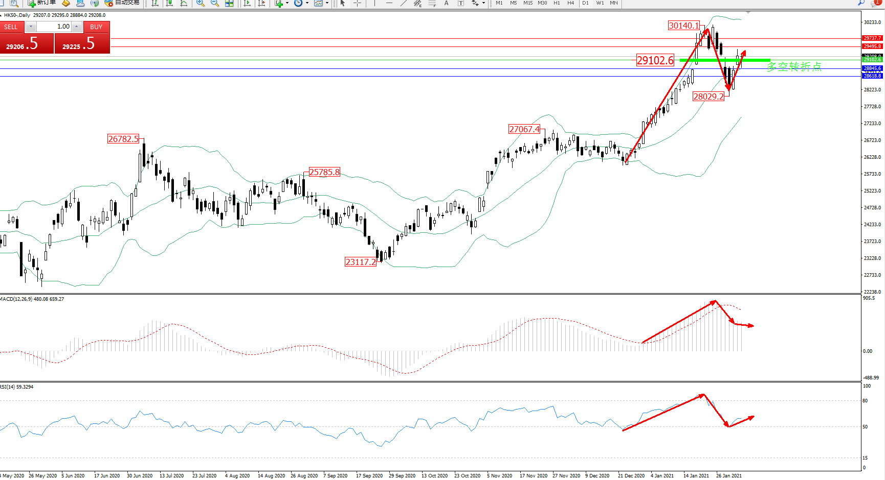 技术点评:多头动力延续布林带指标通道中上轨区间持续震荡上扬至30140位置节点后遇阻开始急速回撤下行,抵达28029位置得到支撑后再度反转向上拉升上扬,处于布林带指标中轨上方震荡中,多头动力有继续上行态势,MACD指标处于多头区域高位震荡回撤后开始走平,RSI指标处于多头区域高位回撤至50均衡线附近节点后得到支撑反转上行中;