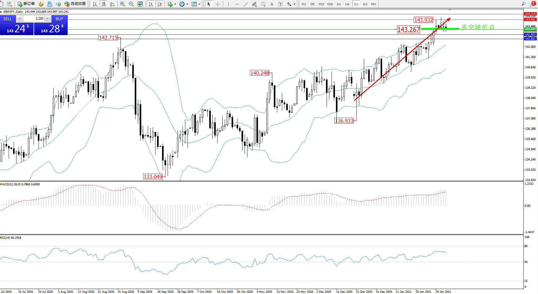 英镑兑日圆高位143.276附近徘徊,英国第三度实施新冠疫情防疫封锁措施已经导致2021年初经济严重萎缩,但在疫苗接种进展的提振下,服务业者对于景气复苏怀抱信心。英国皇家采购与供应学会(CIPS)数据显示,英国综合PMI从12月的50.4降至1月的41.2,远低于景气荣枯分水岭50.0。这是5月以来最低数值,但好于1月初值40.6,并且也不像去年春天英国首次实施封锁时跌到13.8那么惨。英国快速接种新冠疫苗帮助服务业企业的乐观情绪推至2014年5月以来最高,对比之下,疫苗接种缓慢的欧元区信心下降。尽管英国经济在2021年第一季可能大幅收缩,但企业依然相信,被压抑的需求和防疫封锁措施放松将为今年稍后提供复苏的跳板。英国1月服务业PMI从12月的49.4跌至39.5,为5月以来最低,且连续第三个月处于萎缩区域。