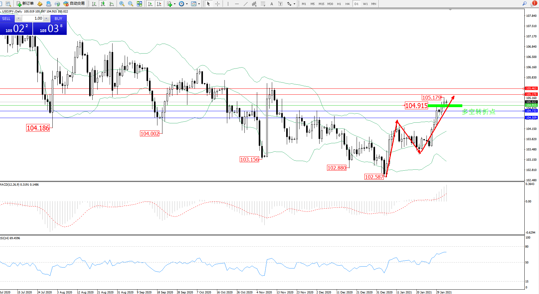 美元兑日圆持续拉升至105.021附近震荡,近期日元兑美元汇率有所走高,必须密切关注对经济和物价的影响。3月评估的关键词是确保日本央行的政策是可持续的、有效的和灵活的。日元过去的过度涨幅在日本央行放松政策中得到修正。将更多资金引向绿色、数字投资的想法超出了日本央行3月份政策评估的范围,但值得长期研究。市场对美国进一步的财政刺激计划重新感到乐观,这被认为是为美元提供一些支撑并推动美元/日元走高。美国国会民主党人在没有共和党人支持的情况下,为推进乔·拜登总统提出的1.9万亿美元冠状病毒救助方案迈出了第一步。民主党就2021财年预算决议展开辩论,其中包括冠状病毒援助支出指示,在共和党的反对下开启了通过刺激支出的立法工具。