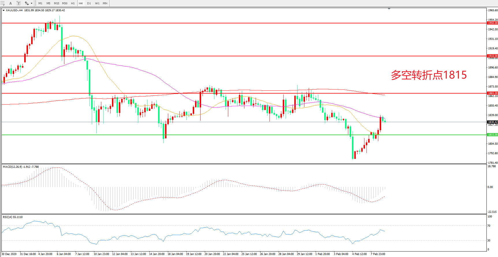 4小时图看,金价阳线连续拉升,短期走势有所回暖,1815一线被突破, MACD绿柱缩短,RSI指标向上,日内延续上行概率较大。