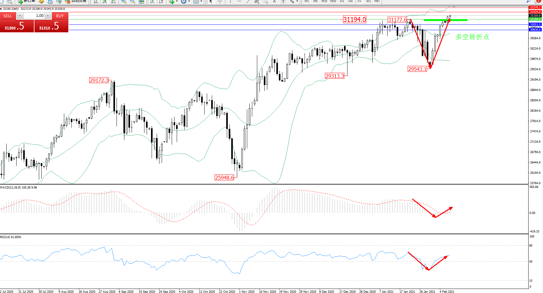 技术点评:高位空头动力维持震荡急速下行,跌破布林带指标下轨附近节点至29543位置后呈V型反转强势拉升,突破前期高位31177位置节点后有继续拉升上扬态势,布林带指标呈缓慢收口走势后有再度张口迹象,MACD指标低位多头动力弱势震荡回升至0轴线上方多头区域徘徊中,RSI指标处于50均衡线上方多头区域整理平缓上行中;