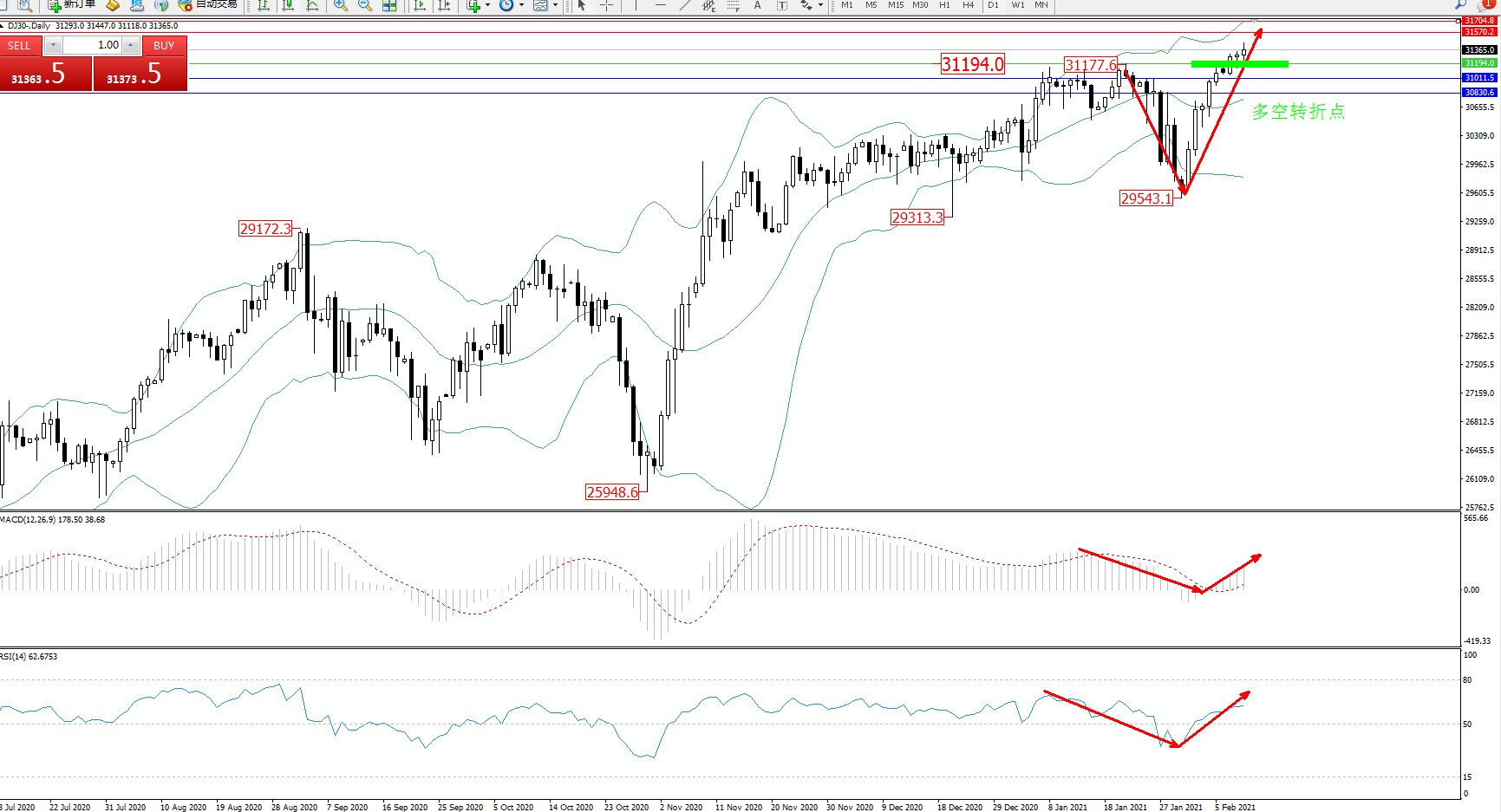 技术点评:高位空头动力维持震荡急速下行,跌破布林带指标下轨附近节点至29543位置后呈V型反转强势拉升,突破前期高位31177位置节点后有继续拉升上扬态势,布林带指标呈缓慢收口走势后有再度张口迹象,MACD指标低位多头动力弱势震荡回升至0轴线上方多头区域徘徊中,RSI指标处于50均衡线上方多头区域整理平缓上行中;