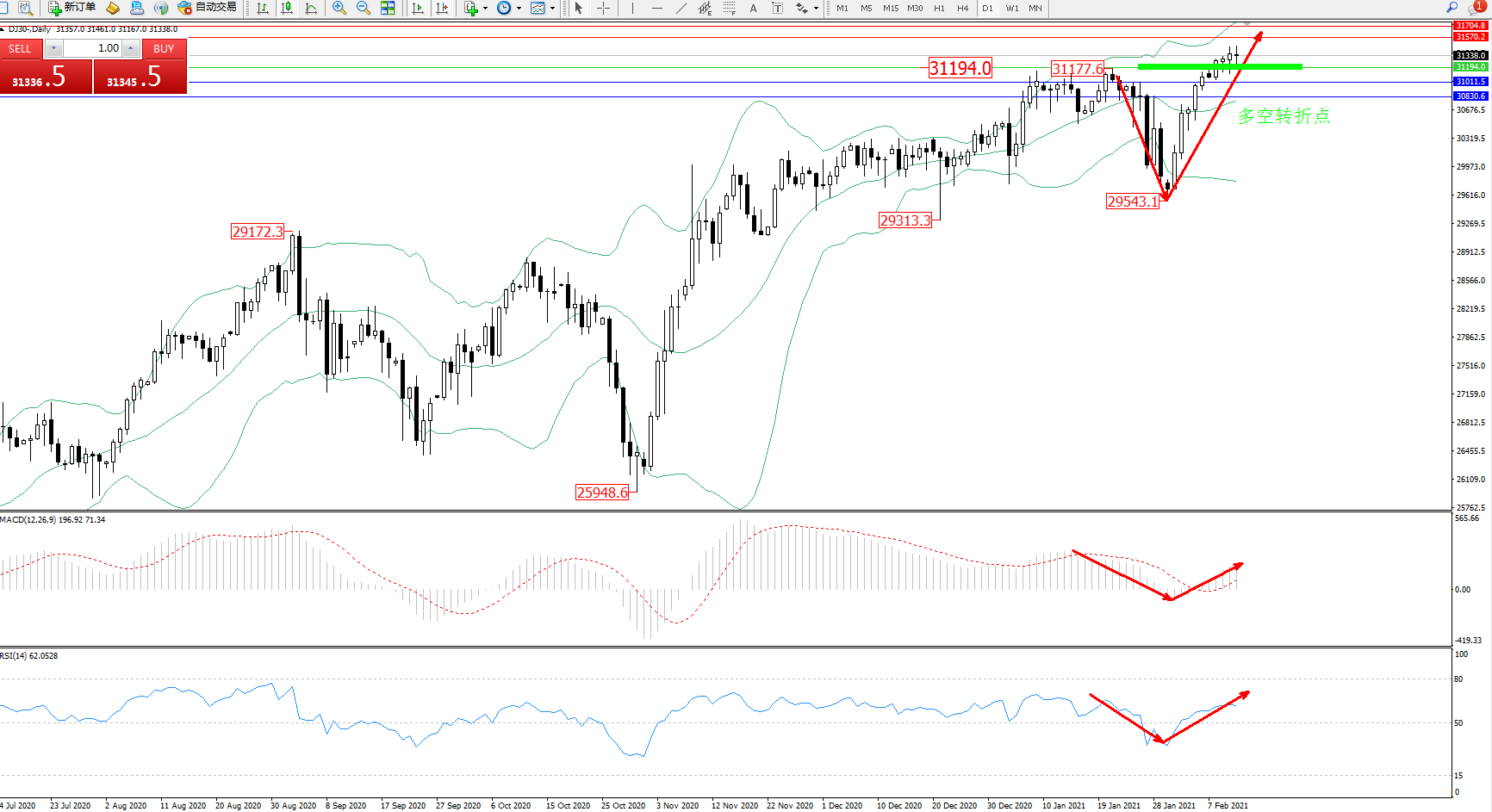 技术点评:高位空头动力维持震荡急速下行,跌破布林带指标下轨附近节点至29543位置后呈V型反转强势拉升,突破前期高位31177位置节点后有继续拉升上扬态势,布林带指标呈缓慢收口走势后有再度张口迹象,MACD指标低位多头动力弱势震荡回升至0轴线上方多头区域徘徊中,RSI指标处于50均衡线上方多头区域整理平缓上行中;