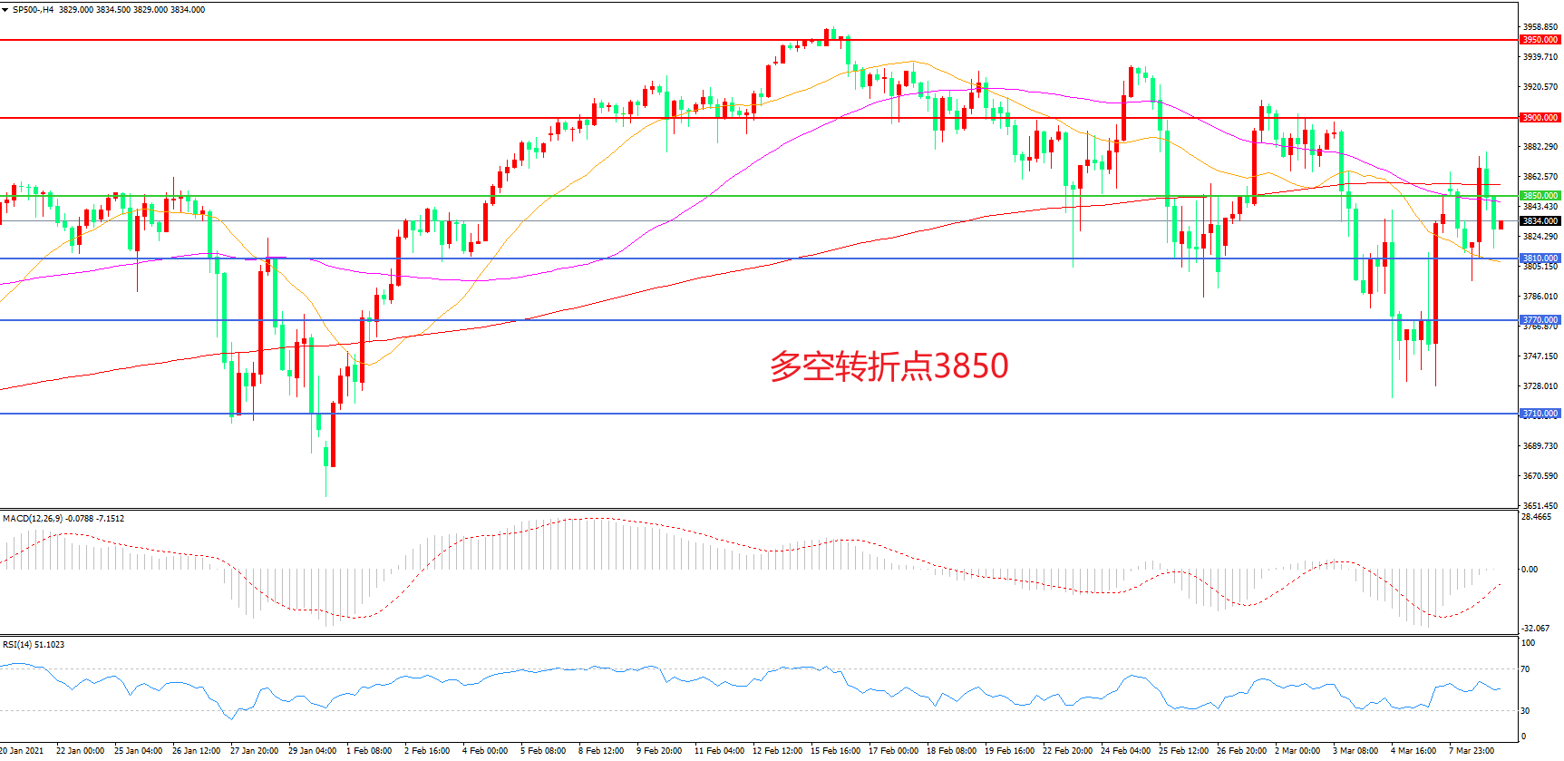 4小时图看,标普500长阳拉升后再度回来,短期走势陷入震荡,均线系统逐渐走平,3810成为短期支撑, MACD绿柱缩短,RSI指标走平,日内延续震荡概率较大。