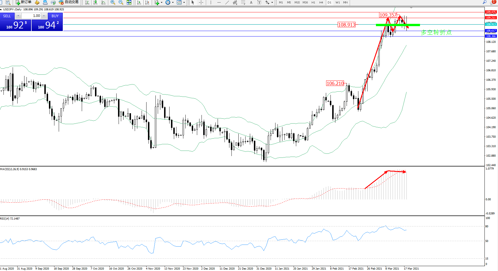 技术点评:多头动力延续布林带指标上轨附近持续震荡上扬,高位抵达109.357附近节点后遇阻开始维持宽幅整理回撤,高位短期或将维持震荡走势,布林带指标呈收口走势持续中,MACD指标处于多头区域高位整理平移中,RSI指标处于多头区域高位80均衡线下方弱势徘徊有下移迹象;