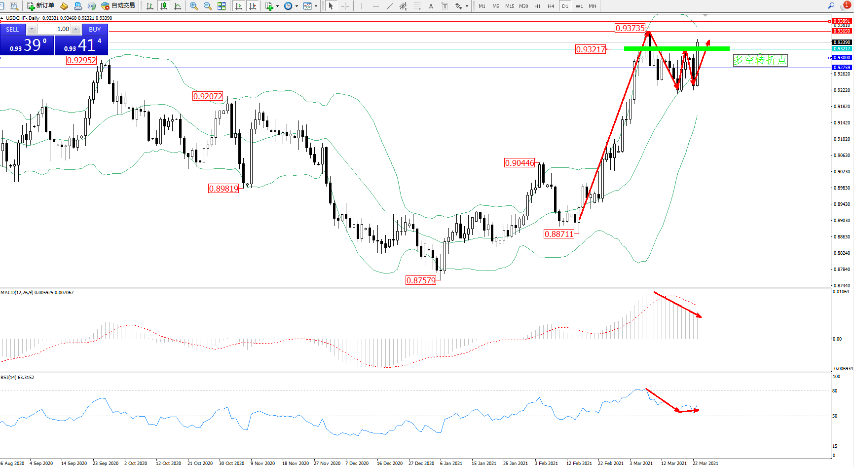 技术点评:多头动力延续布林带指标上轨附近持续震荡,高位抵达0.93735附近后遇阻回撤,高位维持宽幅震荡,多头动力有进一步向上移动中,布林带指标呈收口走势持续中,MACD 指标处于多头区域高位维持整理缓慢下移,RSI指标处于多头区域高位整理弱势向下移动中;