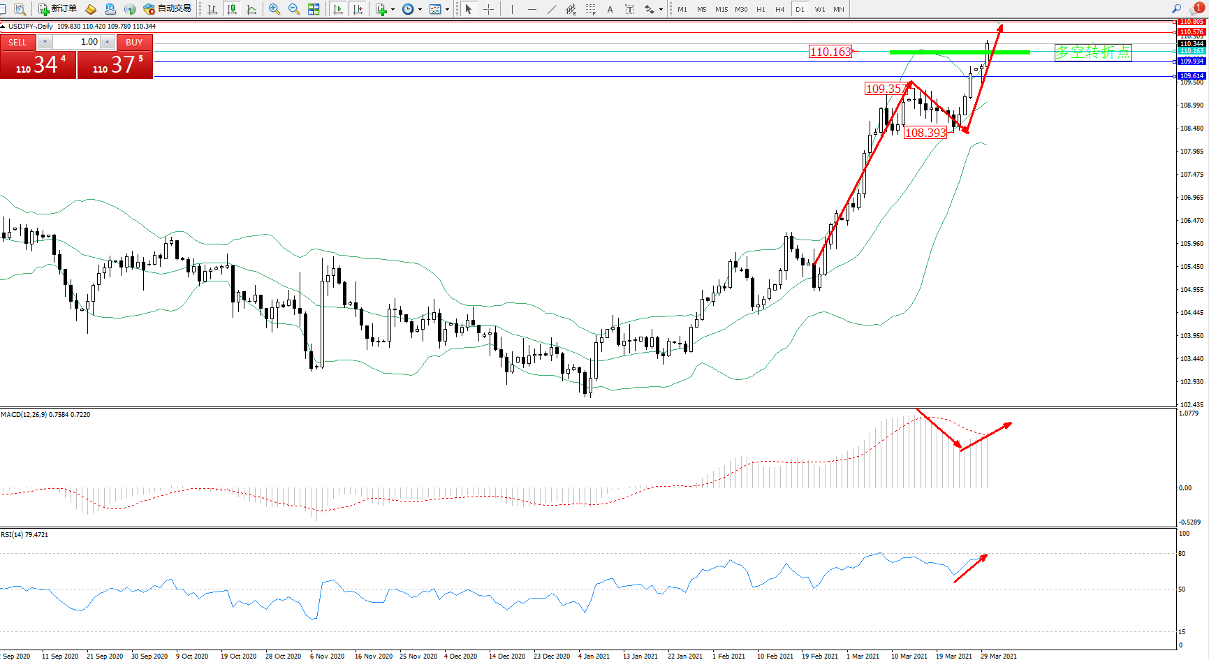 美元兑日圆高位110.344附近强势拉升,美债收益率走高带来的美元回升、美国经济复苏的加速以及风险人气升温导致的避险资产需求下降,所有这些因素使得日元受到了多重打压。疫苗接种加速以及美国大规模刺激激发通胀预期,推动美国公债收益率上涨。美元兑日元大幅上涨,创一年新高,日元受到美国通胀预期高于日本以及美国长期公债收益率上升的影响。日本财年将于本月结束,推高美元需求,因企业寻求结清帐目。目前美元兑日元在G10货币中与美国长期收益率的关联度最高。拜登政府将宣布另一项财政刺激政策,预计将支撑美国长期公债收益率的上行压力。