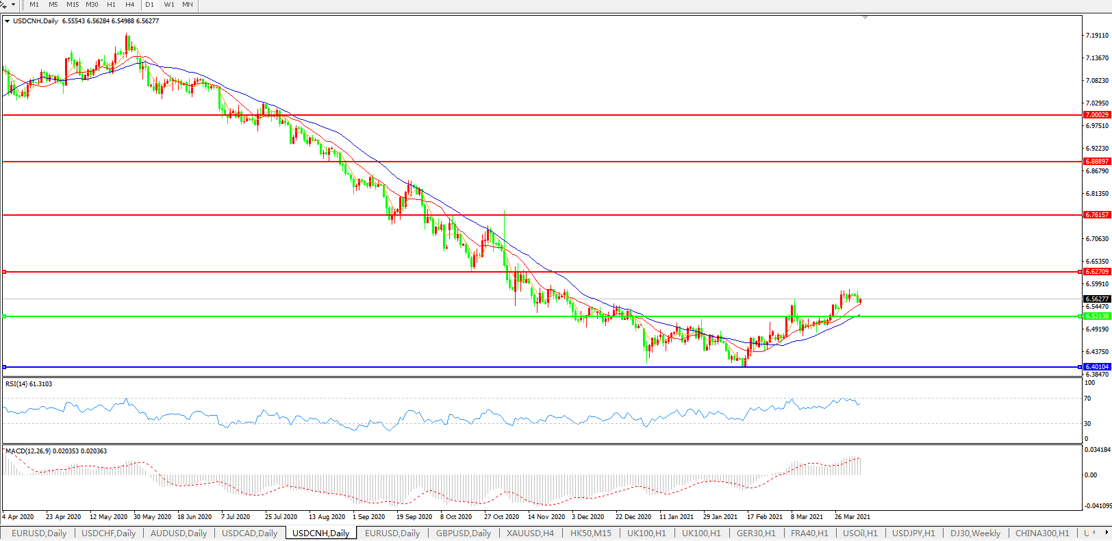 美元兑人民币USDCNH 日线图: