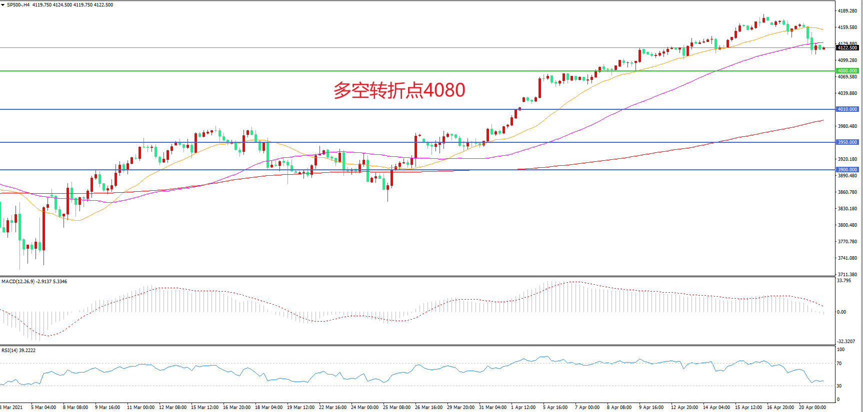4小时图看,标普500大幅拉升后震荡回落,上行趋势暂缓,但整体趋势仍运行在4080只是,多头趋势并未改变,MACD红柱减少,RSI指标走平,日内延续震荡概率较大。