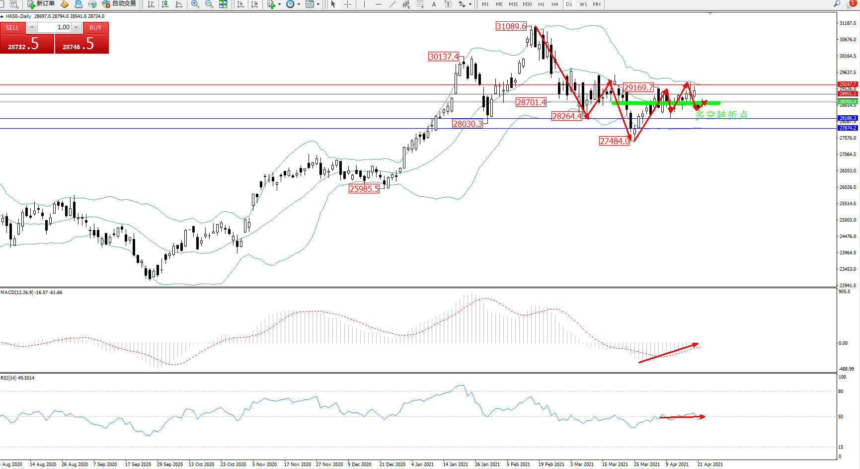 技术点评:空头动力延续布林带指标通道中下轨区间持续震荡下行,低位得到支撑反转上移,纠结于中上轨区间震荡,高位抵达上轨附近节点后遇阻回撤,纠结于中轨附近持续震荡,空头动力有继续回撤下行走势,布林带指标呈整理平移走势持续后有收口下行迹象,MACD指标低位多头动力弱势上移至0轴线附近徘徊,RSI指标纠结于50均衡线附近弱势徘徊中;