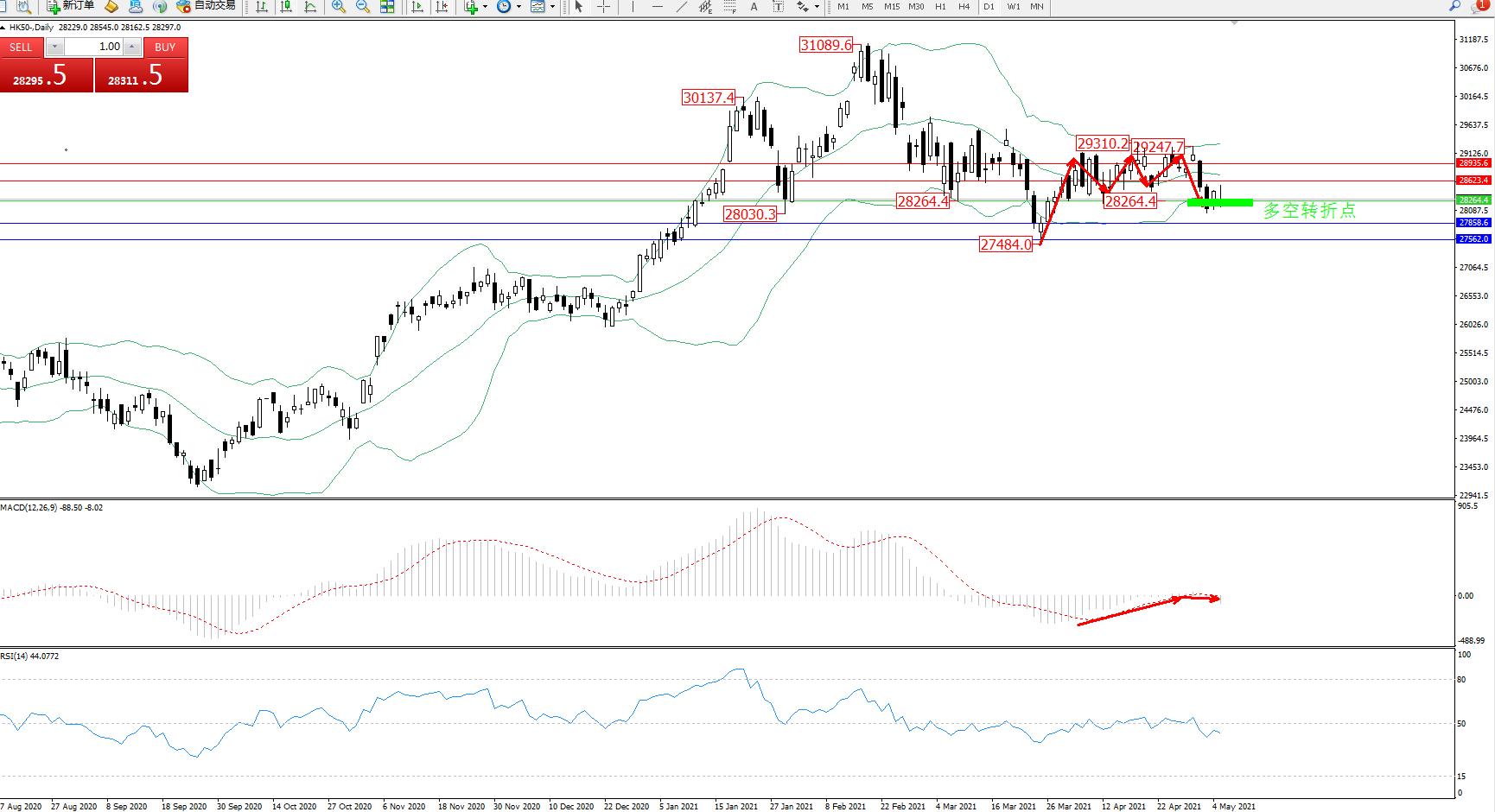香港恒生指数5月5日(周三)收盘下跌139.16点,跌幅0.49%,报28417.98点;港股三大指数全线收跌,科技股普遍弱势,致恒生科技指数大跌2.13%报8107点,大型科技股网易均跌超3%,阿里巴巴跌超2%,京东、美团、腾讯均跌超1%;餐饮股跌幅靠前,近期强势的医美、医药概念股全线回调,复星医药跌超5%,昨日曾创历史新高;银行、石油、香港地产等权重股撑市。大市成交额重回千亿港元上方。渣打香港大中华区高级经济师刘健恒发表报告,指考虑今年开局强劲,上调香港今年经济增长预测由3.5%升至6.9%,料今年余下时间续温和复苏。展望未来,净外部出口带来的强劲贡献料难以持续,不过,假设本地疫苗接种加快,该行认为本地消费、投资及旅游业可逐步复苏。这或可促成潜在放宽出入境限制。该行下调HIBOR预测,以反映3月底以来的跌势,料续支持香港经济,特别是房地产行业。不过,高失业率仍是重大忧虑为经济“拖后腿”,料未来一至两季仍维持7%附近水平。