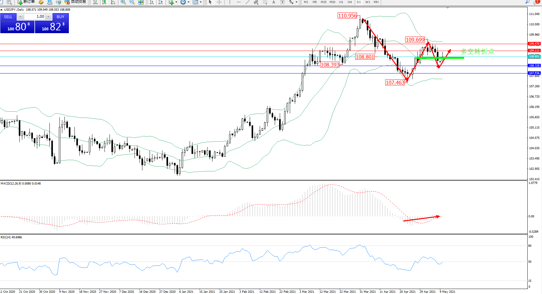 技术点评:高位空头动力延续空头下行走势持续下挫,触及布林带指标下轨附近节点后不断向下移动,空头动力下行至107.463附近得到支撑短暂整理后急速回升,突破中轨触及上轨附近后遇阻维持震荡再度下挫,破中轨附近徘徊,布林带指标呈张口走势后开始缓慢收口中,MACD指标处于0轴线下方空头区域持续震荡后开始有回升迹象,RSI指标处于空头区域整理后急速反转上行,在50均衡线节点附近弱势震荡;
