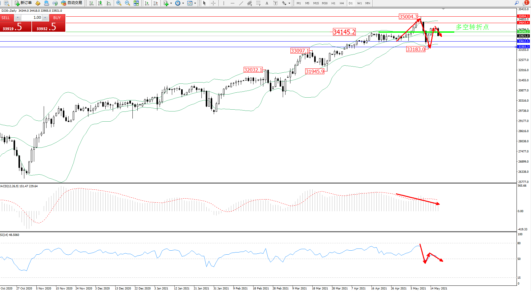 技术点评:多头动力延续布林带指标通道中上轨区间持续震荡上扬,高位抵达35004位置后遇阻回撤,跌破下轨后得到33183支撑开始反转回升,再度回升至中上福区间震荡,多头动力仍具强劲动力,关注中轨附近节点,MADC指标处于多头区域高位震荡后维持弱势整理,RSI指标空头动力急速下挫至50均衡线附近震荡;